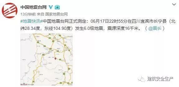 中国地震台网正式测定:6月17日22时55分在四川宜宾市长宁县(北纬28.34度,东经104.90度)发生6.0级地震,震源深度16千米。